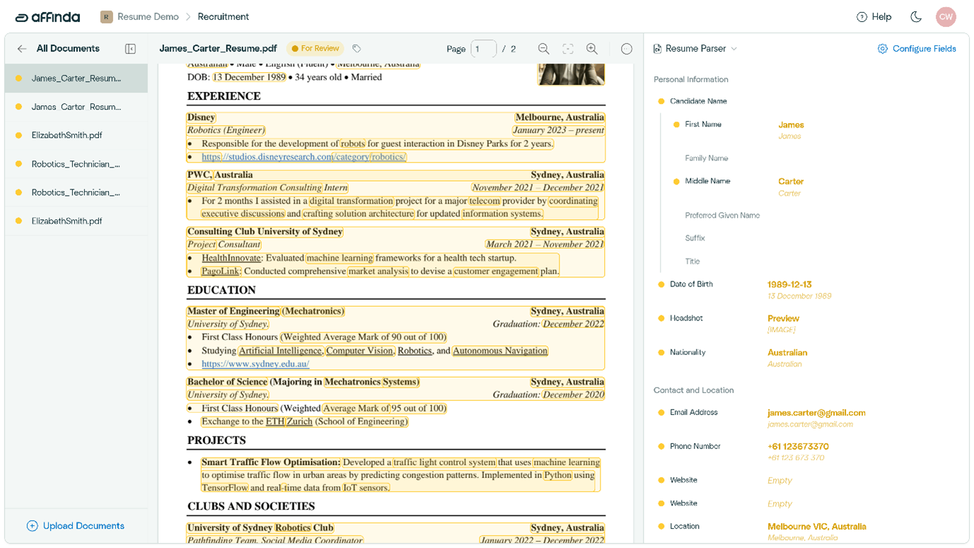 Test Affinda’s resume parser AI for free. It’s fast, accurate and built for scale – perfect for HR tech and platforms, ATS providers and job boards.